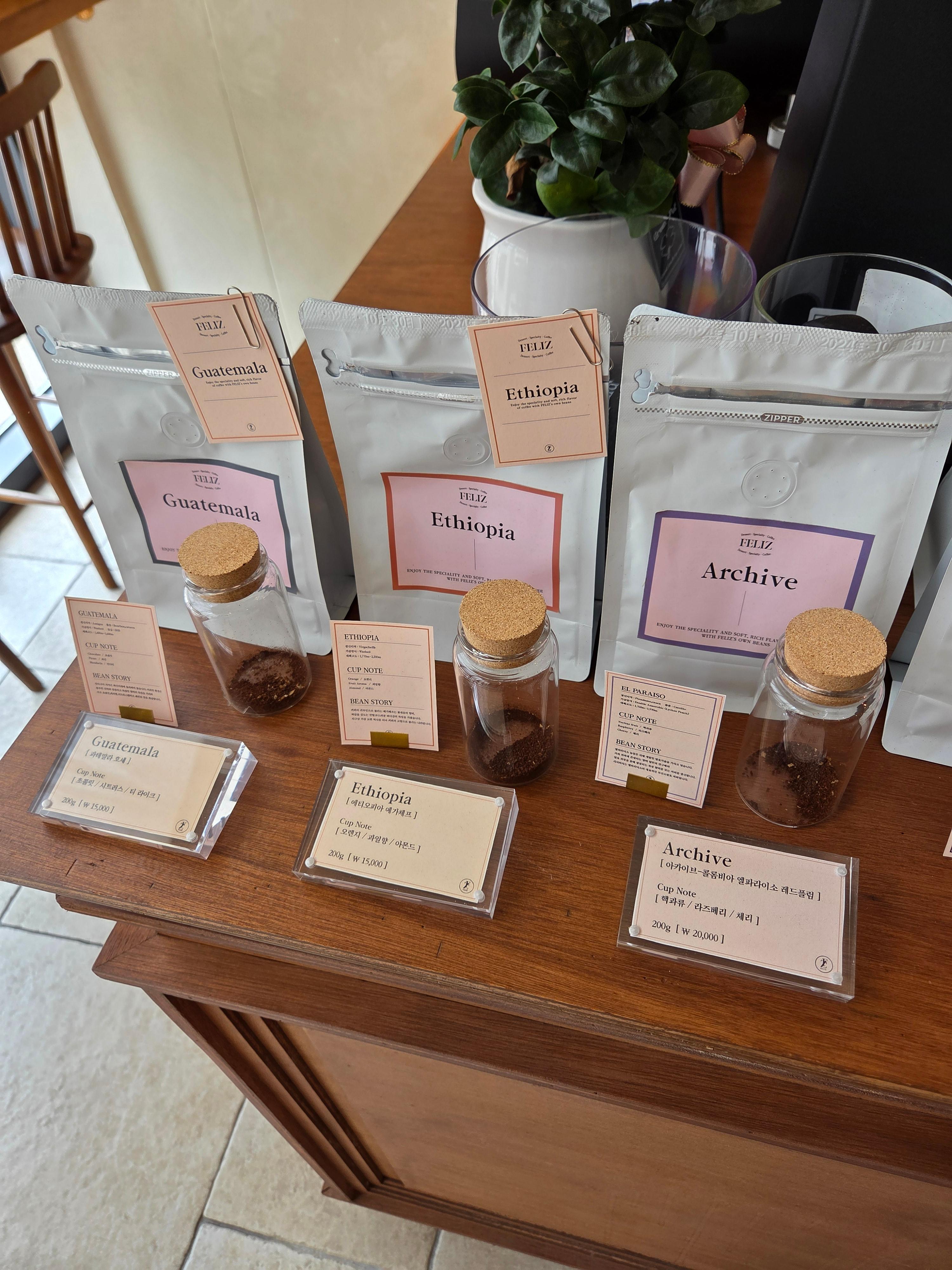 직접 선별한 스페셜티 원두 3종(왼쪽3개 종류)이 진열돼 있던 게 인상적이었어요.